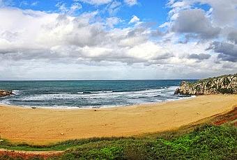 Con una longitud de 300 metros, destaca su enclave entre acantilados, su farallón de levante y las verdes praderas. Es también una de las playas más peligrosas de la zona, debido al fuerte oleaje, las resacas y sus corrientes.