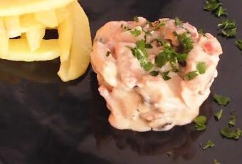 Cogemos una cazuela de tamaño medio, agregamos la nata y la ponemos a calentar a fuego medio, añadimos la cuña de queso brie cortada en daditos (recordad retirar la corteza de queso). Removemos hasta que el queso brie este bastante disuelto y salpimentamos, en este momento ponemos a fuego bajo e incorporamos la mezcla anterior de pollo, bacon y champiñones, removemos y retiramos del fuego dejándolo reposar tapado durante 10 minutos. Servir acompañandolo de unas ricas patatas fritas.