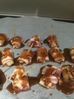 Precalentar el horno durante 20 minutos a 180º, en introducir las popietas, colocadas 1 a 1 sobre papel de horno en la bandeja, y calentar durante 15- 20 minutos. (mirar de vez en cuando hasta que el bacon esté dorado)