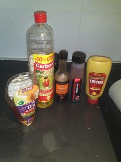 En un recipiente para hacer salsas (en su defecto un vaso donde remover los ingredientes) añadir 2 cucharadas de aceite, 3 cucharadas de miel, 3 cucharadas de mostaza, 1 cucharadita de reducción o vinagre de Modena y una pizca de sal (si tuviéramos, añadiríamos 2 ó 3 gotas de salsa perryn´s). Remover todo hasta conseguir una salsa homogénea.(Rebajar, si fuera necesario, con unas gotas de agua hasta conseguir el sabor y textura deseado).