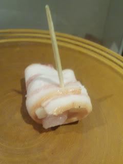 Cortar las tiras de bacon a la mitad, los filetes de pollo en tiras de 3-4cm de largo y 2cm de ancho( a ojo, que el tamaño del pollo sea la mitad que el bacon) y las lonchas de queso en un tamaño similar al pollo. Colocar una tira de bacon, encima otra de pollo y otra de queso, enrollar hasta formar la popieta y atravesar con un palillo a modo de pincho. Una vez hechas todas las popietas reservar en una bandeja.