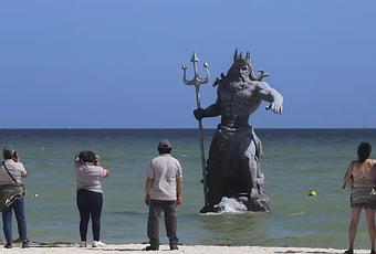 Las autoridades mexicanas anunciaron el jueves por la noche su “clausura” porque su instalación carecía de permisos, una decisión que podría conllevar a la retirada de la escultura del dios griego de los mares de tres metros de alto que sigue mirando la costa con cara enfadada y un tridente en mano como si acabara del salir de lo más profundo del océano.