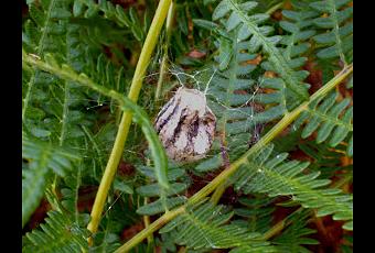 Hace unos días hicimos una corta excursión. En un campo cubierto de helechos, encontramos el nido que fabrica la araña tigre (Argiope bruennichii) colgado entre los tallos y frondes. En este nido, los huevos pasarán el invierno resguardados del frío esperando las temperaturas suaves de la primavera siguiente cuando nacerán las pequeñas arañitas.Esta cesta es tan característica que el aspecto de la misma sirve como identificativo claro de la presencia de esta especie. El sobrecogedor aspecto de esta araña es algo intimidatorio, si bien la literatura consultada nos dice que su mordedura es inofensiva. Para los que no sepan de que araña estoy hablando, a continuación os pongo una foto.
