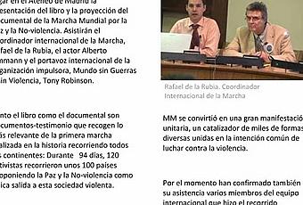 Asistiran: Rafael de la Rubia (portavoz Marcha Mundial) - Alberto Ammann (actor) - Tony Robinson (Portavoz Internacional de Mundo sin Guerras).