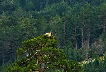 Quizá en los últimos tiempos lo veo todo verde, el verde intenso está presente en la naturaleza cercana, ha llovido mucho entre finales de invierno e inicios de primavera. La vegetación se exhibe con todos los verdes imaginables, pero hay una nota discordante en la copa del pino, porque allí vigila el buitre leonado.