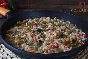 Dejamos cocinar todo 5 minutos y añadimos el arroz, removemos unos segundos e incorpora el caldo, cuando empiece a hervir, echamos el calabacin picado, los guisantes, la berenjena y las judías troceadas (las mías ya con un poco de cocción.Terminamos de cocinar el arroz, unos 17-10 minutos, salpimentamos, rectificamos de sal si hiciera falta. Apagamos el fuego y dejamos reposar unos minutos fuera del fuego.