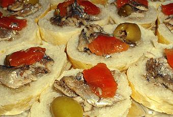 1) Cortar el pan en rodajas de forma que las mismas no queden muy grandes y tostar.2) Colocar sobre cada tostada un trocito de sardina, ½ aceituna y un trocito de tomate.