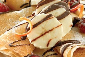 los plátanos. Cuando comiencen a tomar color, añade la mermelada de naranja.2. Calienta las crepas y dóblalas, sírvelas con los plátanos, y decóralas con las frambuesas.Al final báñalas con una deliciosa salsa de chocolate y ralladura de naranja.* *Salsa de chocolate con naranja