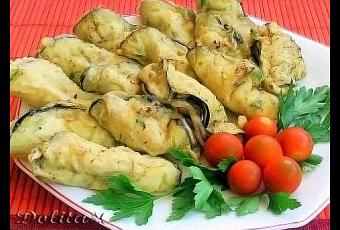 Pasado el tiempo de maceración, vamos rellenando con la carne las rodajas de berenjenas ayudándonos de una cucharita y doblamos por la mitad cerrándolas con los palillos. Preparamos la masa del rebozado mezclando harina con agua helada, un poco de sal, pimienta y la otra yema de huevo. Batimos bien hasta formar una pasta homogénea (ni muy líquida ni muy espesa).