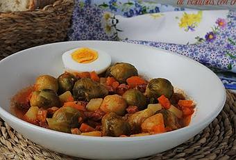 Este estofado estaría delicioso con coles frescas, las que había en la frutería estaban ya amarillentas y no me gustaban. Opté por poner las congeladas y estaban riquisimas la verdad, pero como lo repetiré en más ocasiones y de aquí en adelante ya las tendremos buenas ya que estamos en temporada. Ya se que no es una verdura que agrada a mucha gente, a mi me encanta!! podéis cambiarlas por otra que más os guste, desde luego que si. Es un estofado que con un huevo duro ya plato redondo y sin más, os aseguro que esta delicioso, si os gustan las verduras tenéis delante el plato perfecto..INGREDIENTES: