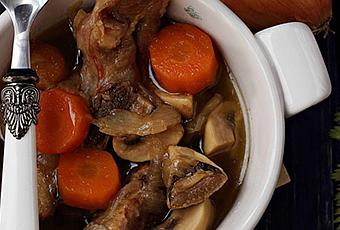 Troceamos la zanahoria y la cebolla. Hervimos en abundante agua salada durante 15 minutos.Salamos al gusto la falda de ternasco, pasamos por harina y freímos con dos cucharadas de AOVE en una cazuela amplia.