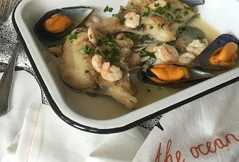- Coloqué por último la merluza con salsa por encima con las gambas y los mejillones.
