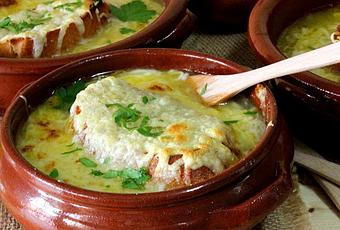 La invención de la sopa de cebolla francesa se atribuye al rey Luis XV. Cuenta la historia que estaba cazando el rey y por la noche cuando se retiró a descansar le dio hambre y se fue a la cocina a prepararse algo, pero solo encontró, agua, cebollas, mantequilla y champagne por lo que usó estos ingredientes para preparase una sopa para cenar.