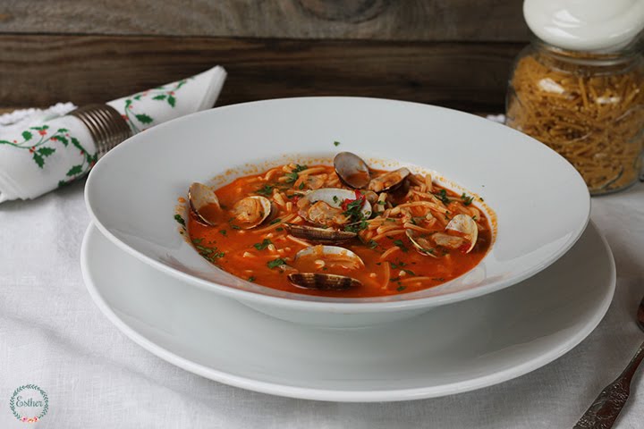 PREPARACIÓN:Dejas las almejas en remojo en abundante agua con sal 1 hora. Enjuágalas, escúrrelas y cuécelas en una cazuela con el vino, 3 minutos hasta que se abran. Reservar unas almejas con su concha y retirar la de las demás. Colar el líquido de cocción y reservarlo. Pelar los ajos y picarlos.Limpia el puerro, la cebolleta, el pimiento y raspar la zanahoria; lavar las cuatro hortalizas, secarlos con papel de cocina y cortarlos en trozos. calentar un hilo de aceite en una cazuela, añadir el ajo y el resto de las hortalizas preparadas y sofreír durante unos 10 minutos.Agrega la salsa de tomate, remover y verter el caldo de pescado y el líquido de cocción de las almejas. Dejar cocer durante 5 minutos, sazonar y triturar. Incorporar los fideos al caldo obtenido, remover y cocer la pasta al dente. Agregar las almejas, espolvorea con el perejil lavado y picado fino, y servir en seguida.
