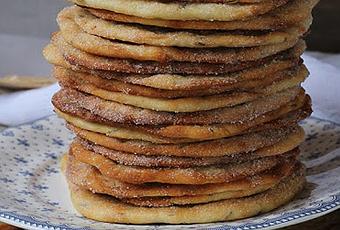 Toma cada porción, haz una bolita con ella y después extiéndela con un rodillo hasta que este bien fina. Al ser una masa con bastante aceite no se te pegara siquiera a la mesa de trabajo, intenta que te queden lo más redonditas posibles, si tienes niños esto te lo ayudarán a hacer encantados.Cada vez que tengas una tortita terminada, pásala por el azúcar y presiona un poquito para que se quede pegado. Repite la operación por el otro lado, es importante que todo este bien cubierto de azúcar (yo solo las pase por una cara, por la que va debajo no le puse).