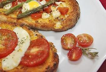 El pan habrá quedado ligeramente tostado pero todavía no muy crujiente. Ponemos entonces los ingredientes en las tostas a nuestro gusto.Nosotros hemos hecho una de tomate y mozarella espolvoreado con orégano y un chorrito de aceite y la otra con el tomate en dados, un poco de mozarella desmenuzada, los espárragos trigueros y los huevos de codorniz en crudo, también con un poco de orégano y aceite.