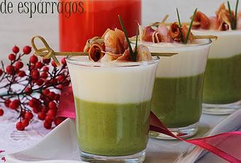 Hice estos vasitos para un entrante y os digo que están deliciosos. Si os gustan los espárragos tanto como a mi, estos vasitos os gustarán muchísimo. Os voy a decir lo que hice, cuando hice el caldo de verduras, le puse una patata pequeña, cuando estuvo bien cocida la saque y la reserve, intuí que la crema verde me quedaría un poco líquida y luego al poner la blanca se me mezclarían, no me engañe, le puse mitad de la patata y quedo perfecta. Esto la receta no lo ponía, pero es que los espárragos tienen mucha agua y el caldo era bastante. El líquido de los espárragos blancos, puse poco, y la nata si queréis aligerar más la receta, le podéis poner leche ideal. Ano ser por estos pequeños detalles la crema es maravillosa, rica y muy fina.INGREDIENTES: