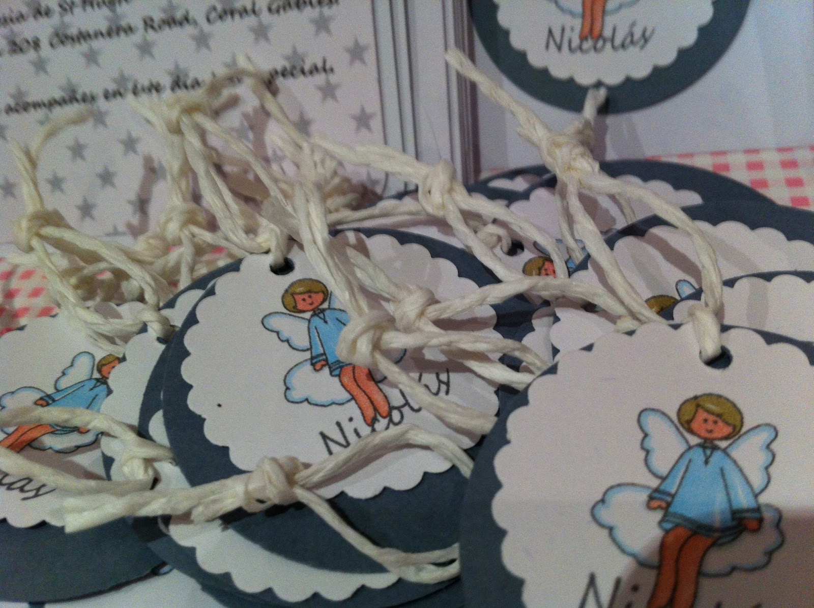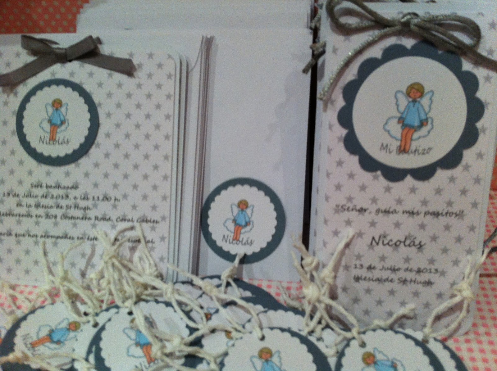 Tenemos,,, recordatorios de bautizo tipo estampita.Van estampados con estrellitas grises