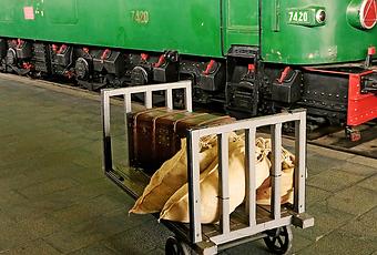 Una vieja carretilla con un viejo baúl y unas viejas sacas delante de un viejo tren