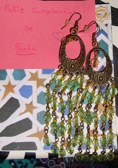 Pendientes largos hippiesEste es un regalo que me hizo mi prima de 10 años! Estaba todo super detallado. Me hizo ilusión porque en verano le pedí un collar y una pulsera que se hacía ella a mano. El día de mi cumpleaños me lo tajo todo en una bolsita junto a la tarjetita de la foto. No os la enseño en la foto porque las llevo puestas. Y quiso agregar estos pendientes elegidos por ella para que me los pusiera en mis looks de maquillaje! :P¿A que tiene buen gusto? ;)