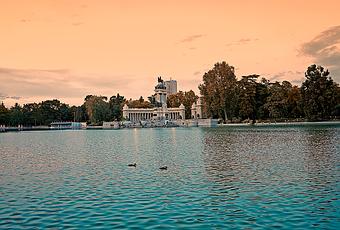 El estanque del Parque del Buen Retiro, en Madrid, al atardecer, con sus patos nadando,