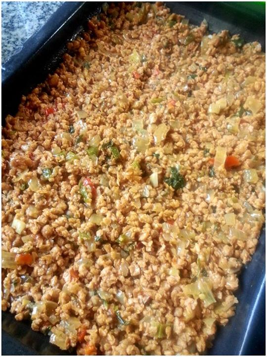 Procedimiento:Aclaración: en la receta de empanadas de carne vegetal cortada al cuchillo dice que la soja texturizada hay que dejarla en remojo. Esto es porque los trozos son muy grandes, en el caso de la soja texturizada fina, yo no la remojo sino que la hidrataré con todo el jugo que se forme de las verduras reahogadas.