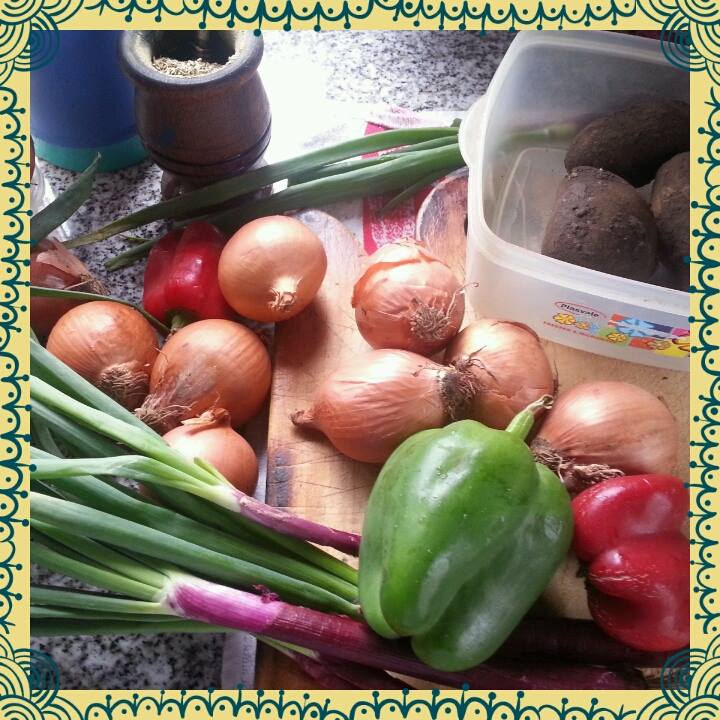 Primero las cebollas hasta que se transparenten un poco. Agrego el ajo, al minuto tiro la cebolla de verdeo y, mas o menos, a los dos minutos agrego el morrón y ají verde. Todo junto lo cocinamos unos cinco minutos.