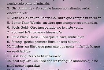 Unas aclaraciones:Debido a que no es el mejor momento en la fandom, espero que con este reto podamos recordar las cosas lindas que hemos pasado con los chicos. Cuando me enteré de que Zayn necesitaba un tiempo para aclarar sus ideas y mejorar su salud, lo entendí y lo apoyé.Ellos no me deben absolutamente nada; respeto sus decisiones y voy a estar con One Direction pase lo que pase, pero en lo que respecta a cómo Zayn manejó la situación… No creo que haya sido lo mejor.Quiere hacer su propia música? Perfecto.Necesita cuidar su salud? Perfecto.Lo que no logro entender es cómo en un par de días puede tirar a la basura cinco años con sus “hermanos”; y sí, estoy diciendo esto por la pelea que ocurrió esta semana en Twitter.Honestamente, no puedo estar del lado de Zayn.Sin importar qué, en lo único que puedo pensar es en la reacción de Louis, Harry, Niall y Liam. Ellos necesitan todo el apoyo posible, y no podría estar más agradecida con ellos por mantenerse unidos a pesar de todo. Es por eso que hago este reto literario, no por Zayn, sino por esos cuatro chicos de las escaleras que siguen sonriendo sólo para hacernos felices.Espero que les guste y podamos recordar todas las canciones, conciertos, videodiarios, fanarts y sonrisas que lograron sacarnos.Si tienen alguna duda, comenten!Lu