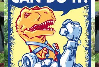 ¡Hay mucho cachondeito con los bracitos del tiranosaurio! ¡Mucho cachondeito! Al menos eso parece ser lo que piensa el ilustrador australiano Nathan Davis (del que ya hablamos por aquí), que toma como punto de partida la icónica propaganda de la Westinghouse Electric, "Rosie the Riveter". En este caso, la ciencia puede hacer que el terópodo bracicorto haga un corte de mangas a su destino del mismo modo que la remachadora Rosie se lo hacía a la sociedad machista de los años 40. El diseño de Davis se ha convertido en camiseta gracias a Shirtwoot!, que la vende por 15 dólares.
