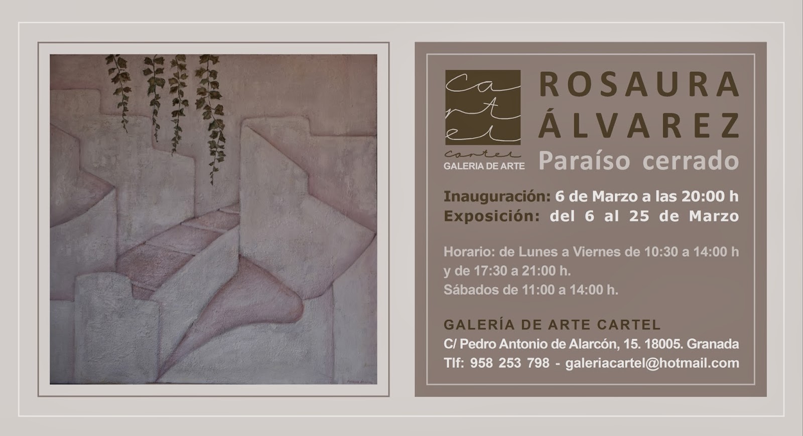 tiene una sustancia que es Granada y a la que el artista expresa por medio de la pintura, como otros lo han hecho con palabras o arpegios. Vengamos al plano de la forma: En él, la sustancia es el óleo, pero ¿y la expresión? Aquí quisiera detenerme. Granada no es una ciudad fácil Todos recordamos hermosos títulos de libros que nos relatan paraísos inasequibles. No es fácil porque las visiones superficiales la han complicado. Rosaura se ha quedado en su Mirador y lo ha visto todo. Pero todo le es ajeno a su visión de Granada. Y ha hecho el sacrificio: ni paisajes, por hermosos que sean, porque los paisajes no son ciudades, ni exornaciones barrocas, ni apenas luces, ni casi colores, ni hombres. Sólo Granada. Ha inmolado cruelmente todo lo que pueda llevarnos a lo superficial y se ha quedado con unas cuantas cosas elementales. Rosaura ha superado la anécdota cínica de Oscar Wilde y no ha caído en la tentación por seductora que fuera. Ha preferido empezar por el principio: ¿Cómo es la verdad de lo que tengo ante mis ojos? Y la verdad es muy simple, sencillísima y monótona, porque si tuviera arrequives ya no sería la verdad. Y esta hallazgo felicísimo la ha llevado a un mundo infantil: las líneas se ordenan en planos; los planos en volúmenes. Líneas, planos, volúmenes. Línea recta porque es el camino más corto para acercar dos puntos (el ojo que contempla, la realidad no escamoteada). Planos para componer escalones de evasión o de hundimiento. Volúmenes blancos, casi marfileños (dadosde Dios que quedaron agolpados cuando el Creador olvidó sus trebejos). Pero, Rosaura al pintar no se detiene en la estructura sino que la interpreta. Son líneas,sí, rectas; es decir sustentos teutónicos para que el edificio no se cuartee. Pero línea es el ciprés; sólo línea. El ciprés se incorpora al cuadro: no como elemento decorativo, sino con la exigencia inesquivable de la columna o el pie derecho. Resulta entonces que ese único elemento vivo se convierte en lógica y deja y deja de ser externo a la función que se le encomienda, se funde con ella y pasa ser elemento de estructura. El arte se racionaliza, pero no deja de ser arte: son peldaños y barandales, muros y esquinas, corredores y silencio. Un silencio enorme y angustiado, que nos hace intuir la tragedia. (Entonces pienso que La casa de Bernarda Alba, esquemática y sin concesiones, pudo estar en este recién nacido Albaicín). La pintura ha traído el silencio y pensamos que, en la otra colina, San Juan de la Cruz escuchaba La soledad sonora, como se escucha en estos lienzos, vacíos de anécdota. Y está el color, un color desprovisto de materia, como la vibración de la luz que tiembla al descomponerse (el blanco se diluye en perla, o en gris, o en pétalos de malva casi marchitos, pero nunca se olvida de su blancura). Color en suprema economía para que nada tiente y el juego sea más difícil. Rosaura Álvarez nos da un Albaicín que es suyo y de cuantos amamos el ascético equilibrio de sus parees o el aplomo de la luz sobre los perfiles. Pienso en Muñoz Degrain: ¿qué ángel le ungió para buscar la lluvia junto al Darro? Ni la luz hiere, ni el hombre cansa, ni la ventana (ni una sola ventana en estos cuadros) llama, ni las campanas retiñen, Sólo la línea y un temblor de luz que se deshace y, lamiendo los lienzos, el sofoco anhelante del silencio. Rosaura se ha descubierto – soledades y rigor mental- en estos cuadros. Ha labrado unos caminos para llegar a Granada.Manuel Alvar