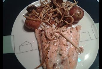 INGREDIENTES PARA 2 PERSONAS: Un filete de salmón para dos, 8 ó 10 papas bonitas o negras pequeñas, un paquete pequeño de gulas, unos 50-70 gramos de champiñones, aceite, 2-3 dientes de ajo, sal, hierbas al gusto y agua.Antes de ir a la elaboración, os dejo el enlace del sorteo de mi primer cumpleblog y finaliza el 9 de abril.
