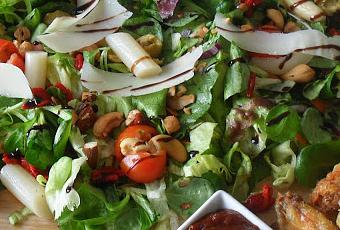 Un salsa especializada en acompañar carnes asadas, muy conocida por ser un gran acompañamiento de unas costillas asadas o incluso unas alitas fritas. En esta imagen la acompañamos con unas alitas fritas y una gran ensalada variada al gusto.