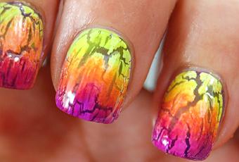 Creo que me estoy aficcionando a los degradados. ¡Una vez les cogí el truco ya no hay quien me pare! Uno de los últimos diseños de la semana es este degradado sobre craquelado. Bueno, en realidad hice dos porque el primero no me gustó nada, sobretodo porque no se ve el craquelado debajo (es el amarillo, azul y violeta). Para ello me di cuenta de que era necesario utilizar esmaltes tipo neón o que cubran poco y así se puedan ver las vetas debajo.El primero diseño que hice salió mal, aunque me gustan más los colores que utilicé. En el segundo se aprecian mejor los efectos del esmalte crequelador, pero aún así creo que para la próxima vez saldrá mejor. Bajo estas líneas podéis ver el proceso del segundo diseño.