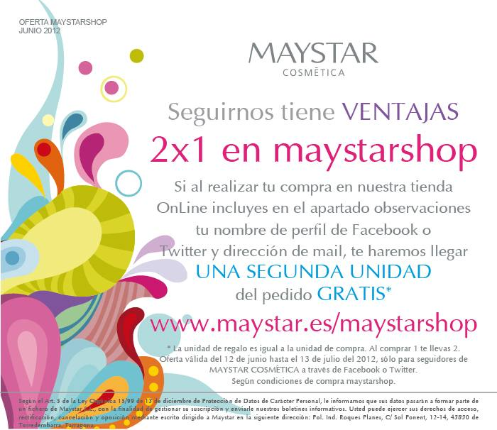 Dentro de nada tendré que hacer un pedido, esta marca se puede encontrar en centros o también tiene tienda online de Maystar. Además este mes tienen una oferta super buena de 2x1 que me han mandado por mail ya que soy seguidora por Facebook Os dejo la información por si os apetece.Un besito y a cuidar estos cuerpazos que la naturaleza nos ha dado :D