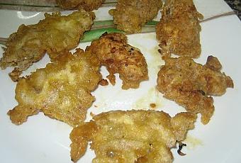 Tras este proceso laborioso y un tanto asquerosillo, salpimentamos los trozos, los pasamos por harina y huevo batido y freimos en abundante aceite hasta que se doren.