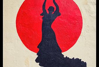 Este trabajo ha sido encargado por la bailaora Sara Ruiz "La Pipi" para decorar la fachada de su academia de baile. Esta silueta forma parte del logotipo.La figura mide 1.20 m., aparte del círculo con 50 cm. de radio aproximadamente, digo aproximado porque lo tracé con una simple cuerda. La pared no estaba en las condiciones más adecuadas y se procedió a un lijado para eliminar restos de pintura que permanecían levantados y dejar el soporte de la mejor forma posible.El trazo del dibujo, previa ampliación, lo realicé con un estarcido, esto es realizando pequeños agujeritos en la línea del dibujo y una vez fijado el papel a la pared golpearlos suavemente con una muñequilla de carboncillo, con el fin de que traspase esos orificios y quede adherido a la pared.La pintura utilizada es plástica de una buena marca y la aplicación se realizó con pincel y brocha.