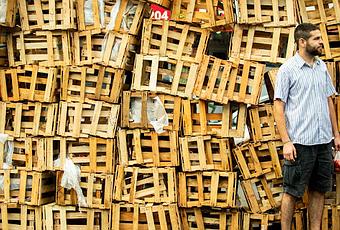 En la fotografía existen reglas de composición, en esta foto se rompen dos reglas: la regla de la mirada y la regla de los tercios. En la fotografía y en la vida para tener un resultado extraordinario, ir más allá de lo establecido, de lo conocido, animarse y saltar para crear algo nuevo. El orden es importante, nos trae seguridad y estabilidad, por eso la mente ama los patrones repetidos, en esta foto las cajas son patrones, convenientemente ordenados, pero si no salimos del patrón nunca podremos descubrir otros mundos, otras miradas y posibilidades. El orden también necesita del caos.Cuando mi primo Josema me pidió una foto con los cajones del Mercado 4 de Asunción de fondo hice varias tomas con él en el centro, pero fue la última toma cuando ya estábamos terminando la tarea para la clase de fotografía, salimos del encuadre y del orden. Lo programado: una foto para la expo de mi clase de fotografíaLo encontrado: lecciones de vida y una media beca para seguir estudiando esta apasionante disciplina.Gracias a mi primo Josema Vázquez por la paciencia a esta aprendiz de fotografía, a los profesores y compañeros del curso intensivo de fotografía del Instituto Técnico de la Imagen.Febrero 2019Mercado 4. Asunción, Paraguay