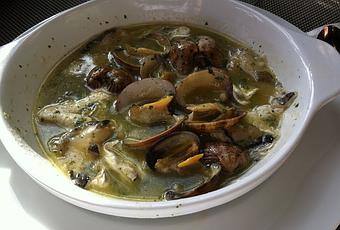 ponemos en una olla el agua a hervir con la cabeza de rape y la merluza salpimentada. Por otro lado, en una sarten ponemos el aceite para dorar el ajo y puerro picado. A continuación añadimos las almejas y una pizca de sal. Salteamos las almejas y agregamos el vino de jerez. Una vez comiencen a hervir las añadimos al agua hirviendo. Dejamos cocer todos los ingredientes a fuego lento durante unos 15 minutos añadimos perejil picado y retiramos los restos de la cabeza de rape.