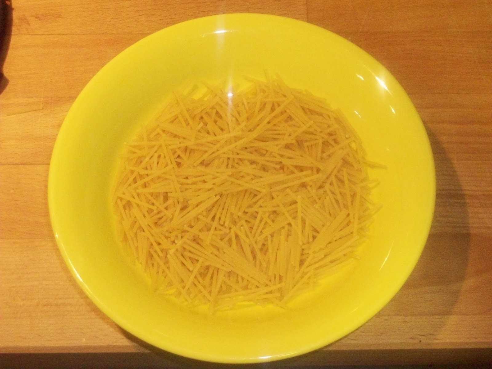 Lo fácil seria para esta sopa es echar fideos, estrellas o puntitos. Pero yo hoy he ido un poco mas. He cogido y he partido espaguetis en trozos pequeños. Después de que pasen los 25 minutos hirviendo el caldo, echamos los espaguetis y lo ponemos a hervir 15 minutos mas.