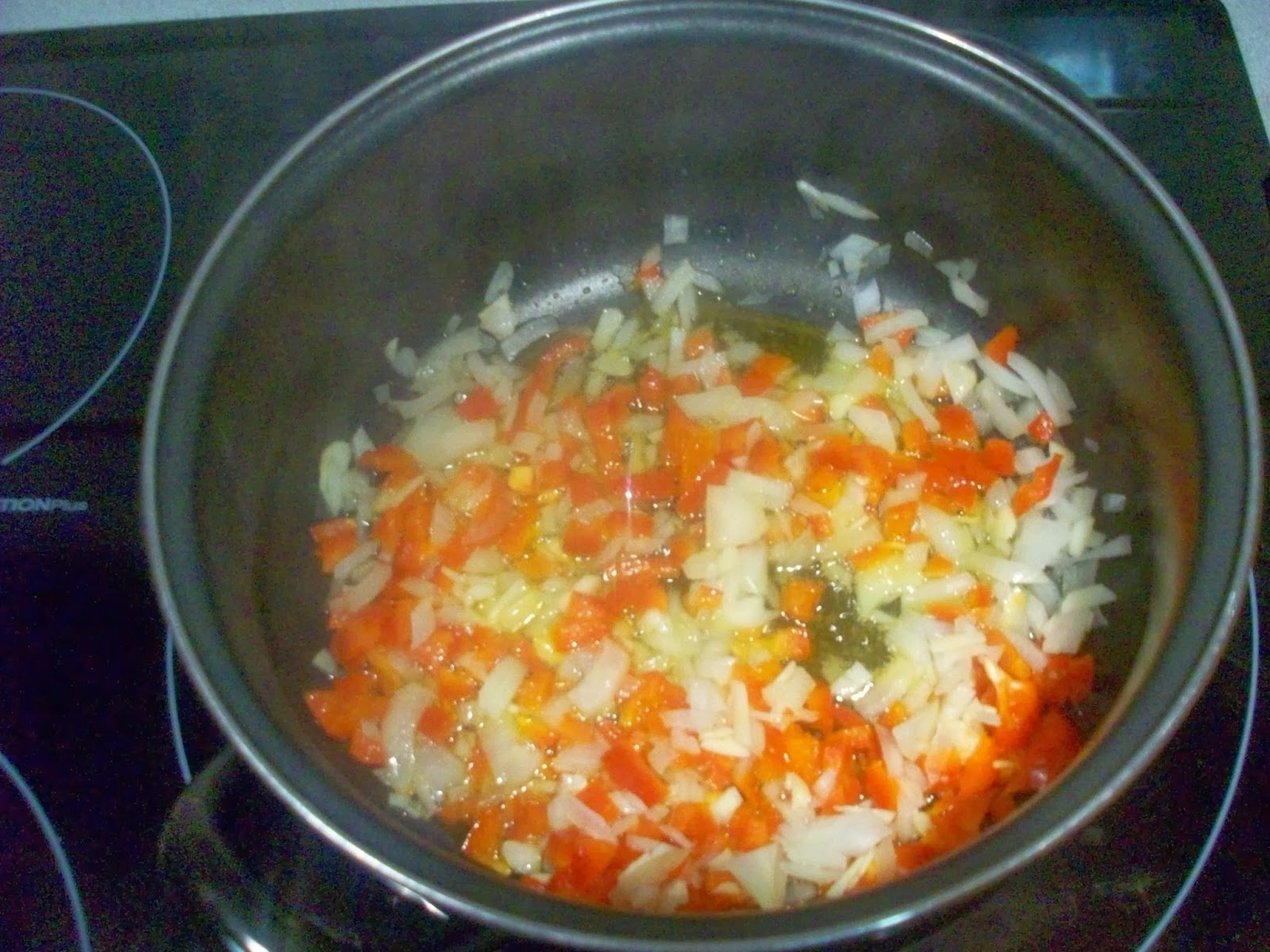 Lo primero que vamos hacer es echar en una cazuela aceite de oliva. Cubriendo todo el culo de la cazuela de aceite. Cuando este el aceite caliente, echamos una cebolla picada, tres dientes de ajo picado y un pimiento rojo picado en trozos pequeños.Rehogamos, a fuego lento hasta que vaya cogiendo color.