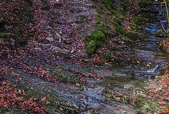 Bien pronto hay que dejar la pista para introducirse en el bosque cruzando un pequeño curso de agua que parece bajar por una escalinata.