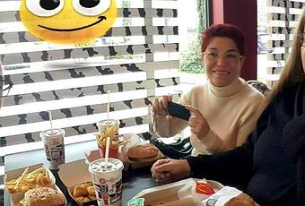 Al llegar, apenas tenemos tiempo de comer, por lo que entramos en un Burger y echamos mano de la llamada "comida basura" -tengo que confesaros que es la primera vez que la tomo- y me dejo aconsejar por una de ellas. Me pido una hamburguesa con bacon, patatas y café con helado.