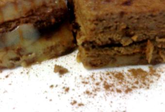 Tapamos con otra capa de galletas y cubrimos estas con natillas de chocolate. La siguiente capa de galletas la cubriremos de nuevo con flan y la siguiente de chocolate. Podemos poner tantas capas como queramos, las cantidades no están especificadas por esto mismo, y podemos poner la cantidad de flan y chocolate que queramos. Finalizamos siempre con una capa de flan que lo cubra todo y dejamos enfriar.Cuando esté frío guardamos en la nevera y antes de servir, le damos la vuelta, sale fácilmente gracias al caramelo, y espolvoreamos con canela y cacao en polvo y almendra picada.¡A disfrutar!