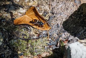 Un poc más abajo del agujero de la fuente me encuentro un pequeñi grupo de avispas asiáticas captando agua.
