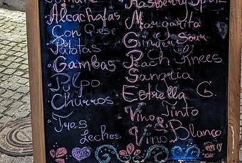 Una pizarra bastante completa con las típicas tapas y bebidas que piden los turistas en España. Pero sin duda no está pensada para españoles de visita en Tallinn.