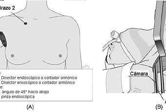 Procedimiento robóticoSe realiza una segunda incisión en piel de 0,8 cm para la inserción de los 4 brazos robóticos, sobre la pared torácica anterior, del lado del tumor (2-4 cm superiormente y 6-8 cm medialmente al pezón y lejos del esternón). El atraque robótico se realiza después de colocar el retractor externo. Un telescopio de 30º de doble canal, controlado por el cirujano, se coloca luego en el centro de la incisión. Un disector de Maryland y tijeras curvas conectadas al bisturí armónico (ambos de Intuitive Surgical) son colocados después en ambos extremos laterales de la incisión axilar. Una pinza Prograsp (Intuitive Surgical) es insertada luego, a través de una segunda incisión. en la pared anterior del tórax y colocada lateralmente a la rama esternal del músculo ECM. La glándula tiroides es retraída utilizando una pinza Prograsp en el 4º brazo robótico y la disección es realizada utilizando una tijera curva armónica y un disector de Maryland. Este procedimiento le permite al cirujano usar 3 brazos robóticos durante la tiroidectomía robóticamente asistida. Los detalles del procedimiento robótico fueron descritos en reportes previos de los autores [19-21] (Fig. 2A, B).