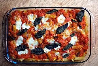 En este punto os podéis comer así las pasta con la salsa (que estará de muerte), o podéis poner por encima un poco más de albahaca y la mozzarella desmigada y gratinarlo 10 minutos en el horno. Así lo he hecho yo y queda muy bien si vais a servirlo en la mesa.