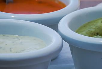 Las tres salsas típicas de Lanzarote y de todas las Canarias, el mojo rojo picante para la carne, el verde menos picante para el pescado, y el blanco con más sabor a ajo.