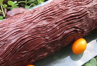 - Verter sobre el rollo de bizcocho y repartirlo con la ayuda de una espátula, procurando que las ramas queden bien pegadas al tronco.