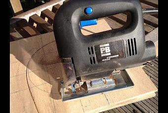 With the base cut out, I drilled a pilot hole in the centre. I don't have a work bench, so I used my garden bench. Close enough! I just made sure I drilled between the slats.